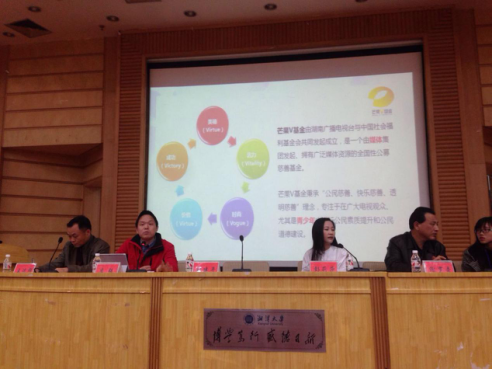 刘建平副校长主持,芒果V基金李强副秘书长发表了讲话,主要解释芒果V基金的介绍以及做公益的目的和意义。